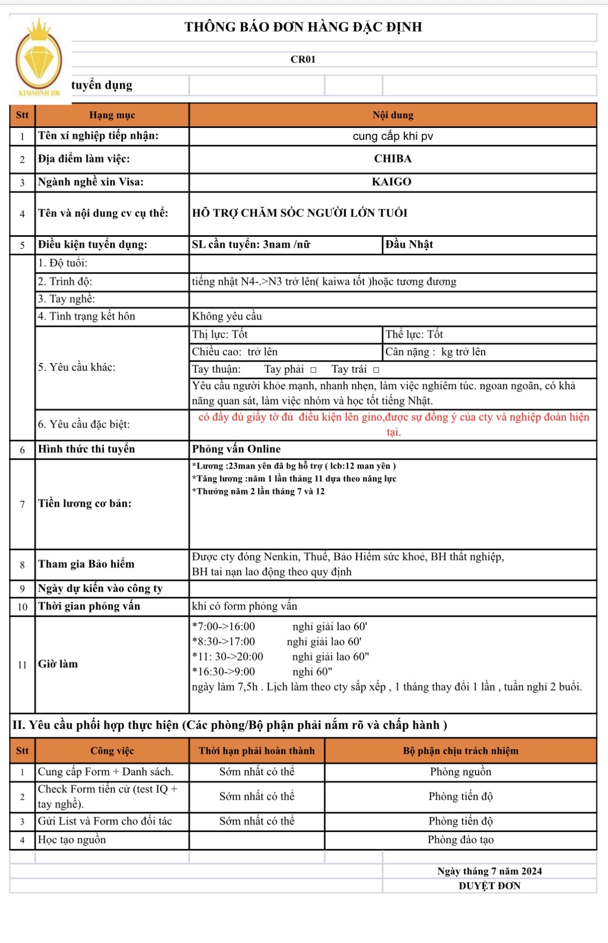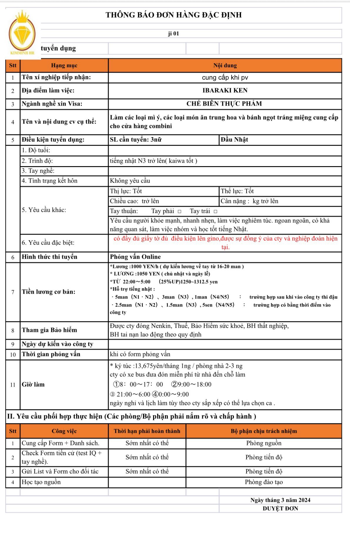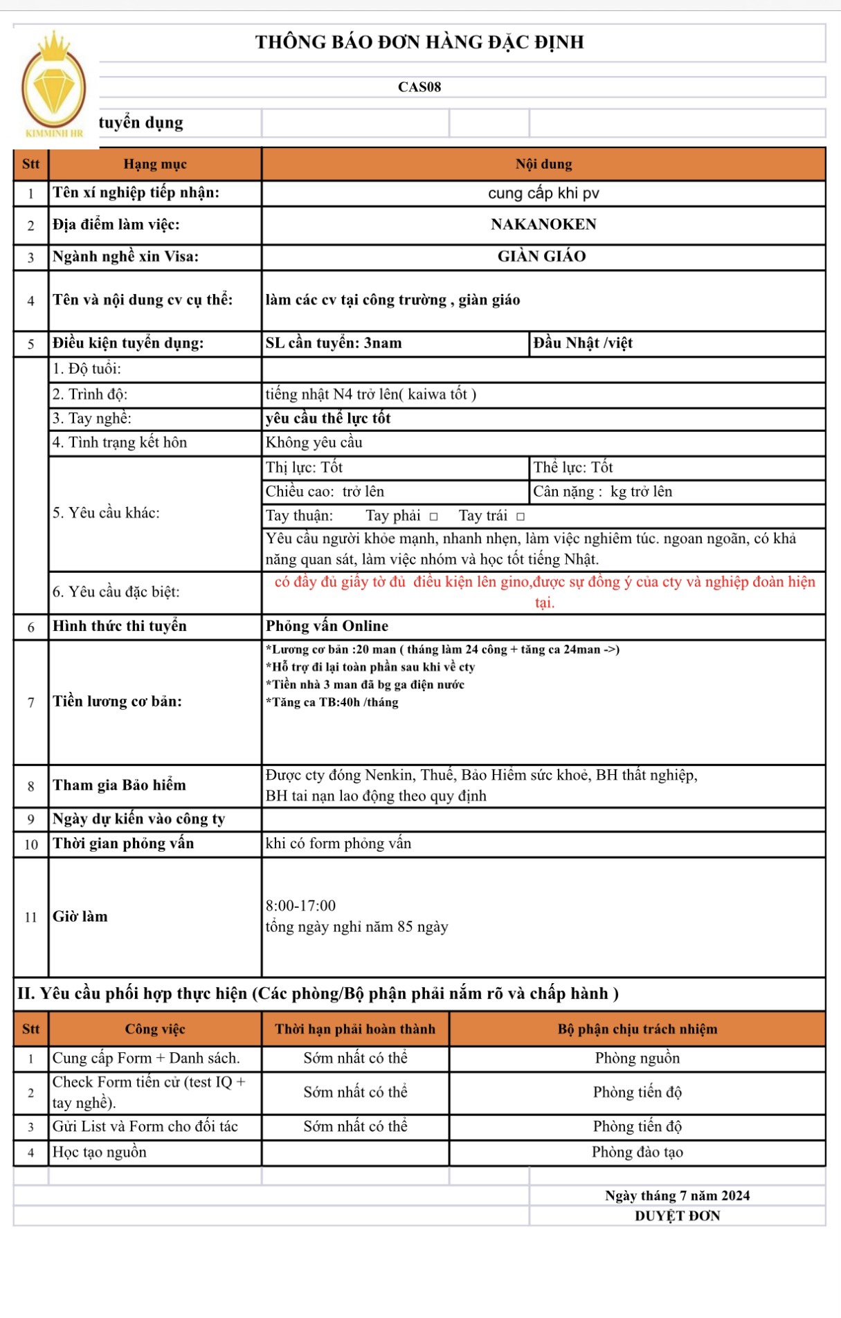 Để biết chi tiết các đơn hàng thời gian thi, tuyển xin mời quý anh chị liên hệ trưc tiếp tới Công ty Kim Minh hoặc đường dây nóng 0982734383