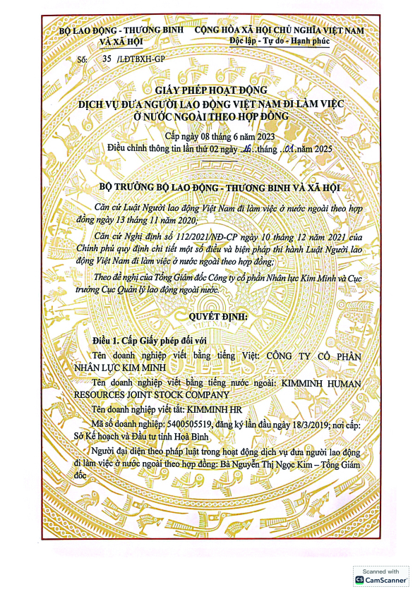Công ty Cổ phần Nhân lực Kim Minh được Bộ lao động thương binh và xã hội cấp giấy phép xuất khẩu lao động số 35 LĐTBXH - GP cấp ngày 8 tháng 6 năm 2023